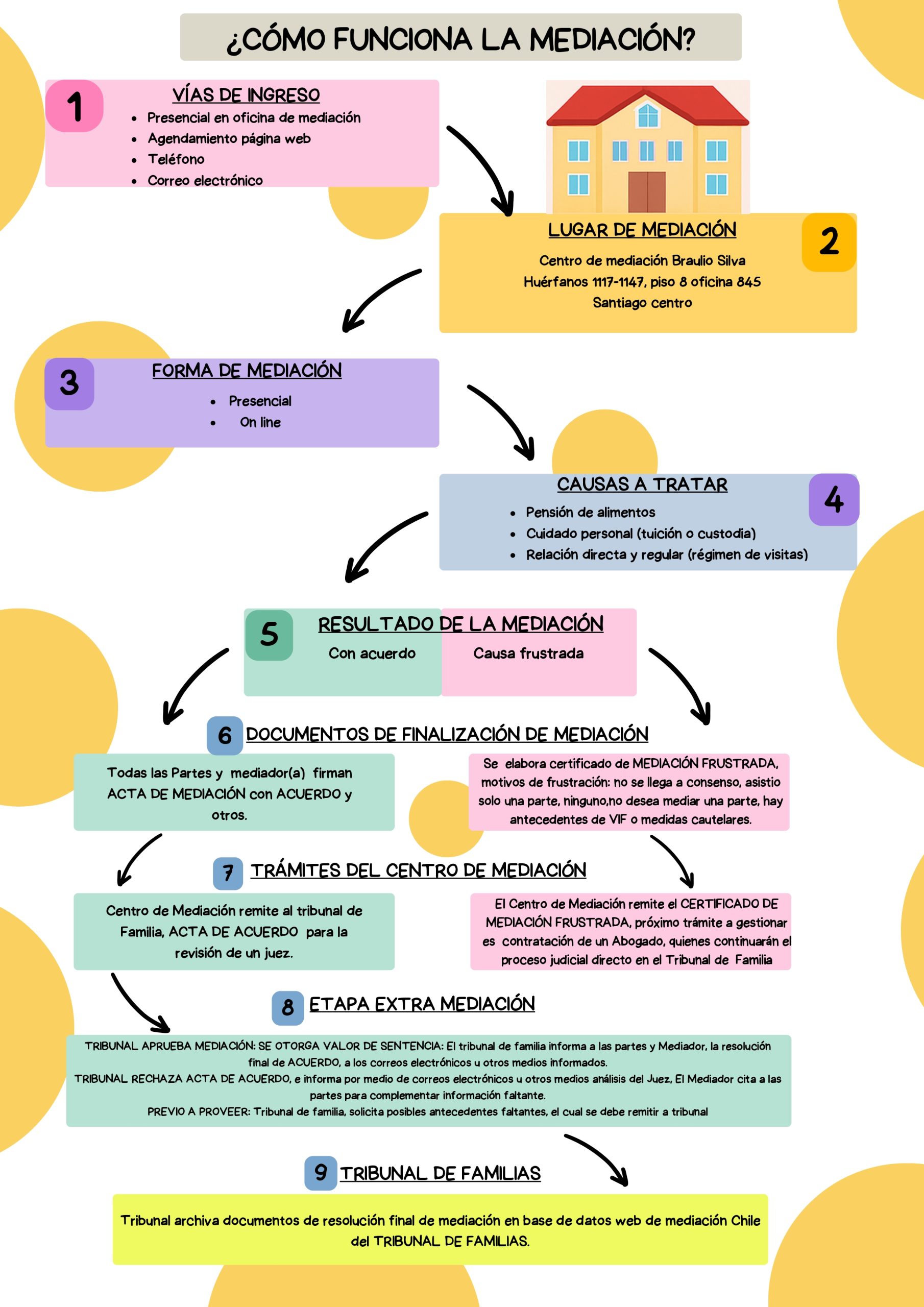 Mediación Familiar: En Chile con la Ley Nº 19.968, se crea “Los Tribunales de Familia”, publicado en el Diario Oficial del 30 de Agosto del 2004, que según el Título V, del Articulo 103. Dice: “Mediación. Para los efectos de esta ley, se entiende por mediación aquel sistema de resolución de conflictos en el que un tercero imparcial, sin poder decisorio, llamado mediador, ayuda a las partes a buscar por si mismas una solución al conflicto y sus efectos, mediante acuerdos. Y en el inciso 1 del Artículo 112. Dice: Registro de mediadores. La mediación que regula el presente Titulo solo podrá ser conducida por las personas inscritas en el Registro de Mediadores que mantendrá, permanentemente actualizado, el Ministerio de Justicia a través de las Secretarias Regionales Ministeriales, con las formalidades establecidas en el reglamento.